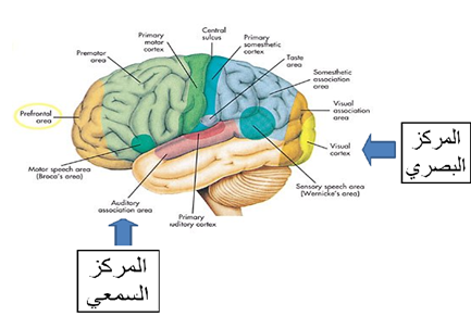 - اما من الناحية التشريحية: فإن مركز السمع يقع في الفص الدماغي الصدغي ومركز البصر خلفه في الفص الدماغي القفوي في مؤخرة الدماغ