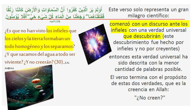 ¿Es que no han visto los infieles que los cielos y la tierra formaban un todo homogéneo y los separamos? ¿Y que sacamos del agua a todo ser viviente? ¿Y no creerán? (30),,,,S,AL ANBIYAA